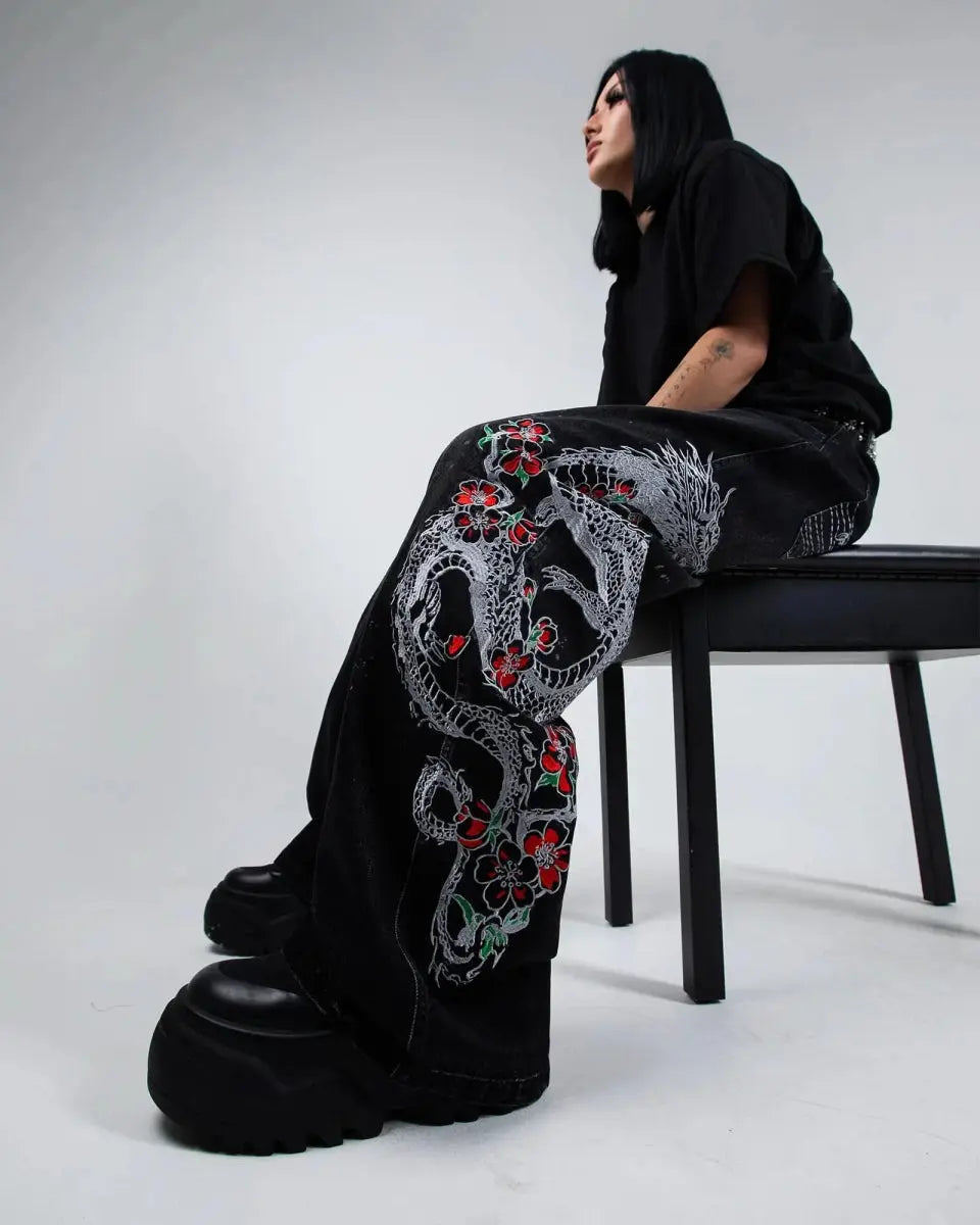 Left leg embroidered graphic: "Sakura Dragon"