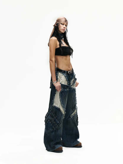 • A-Line Loose Fit.• Unisex.• 100% Cotton.• Blue And White Denim Color-Blocking.• Armor Elements Are Designed At The Knees.• Tone-On-Tone Belt At Waist.