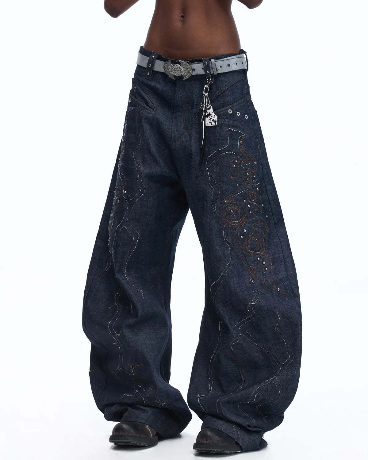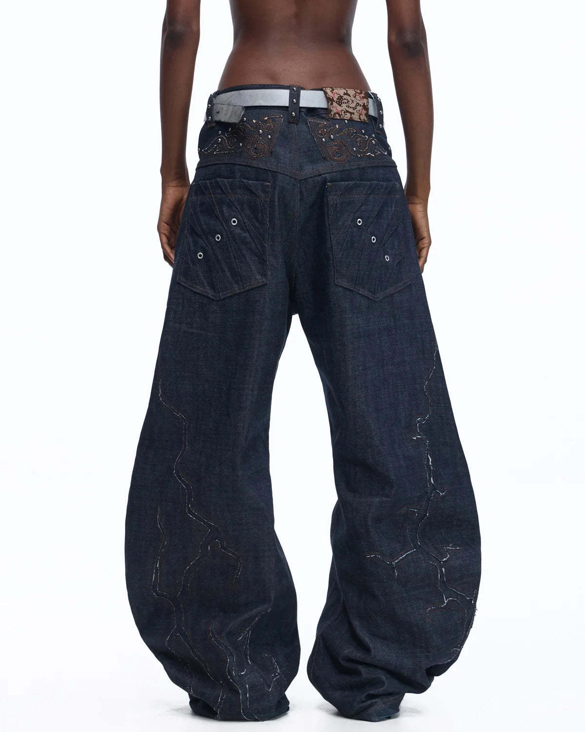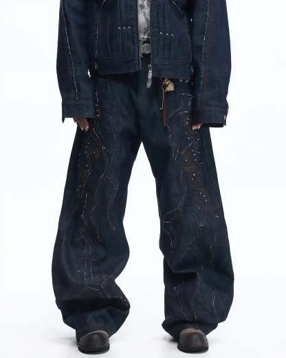Personsoul Patchwork-Embroidered Raw Denim Curved Pants