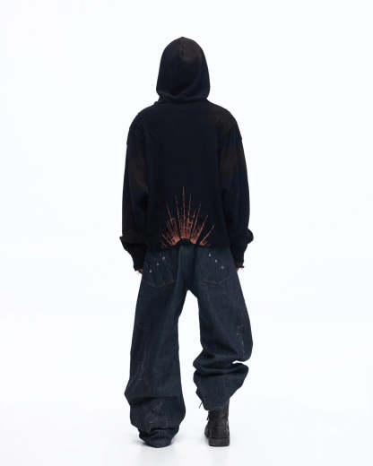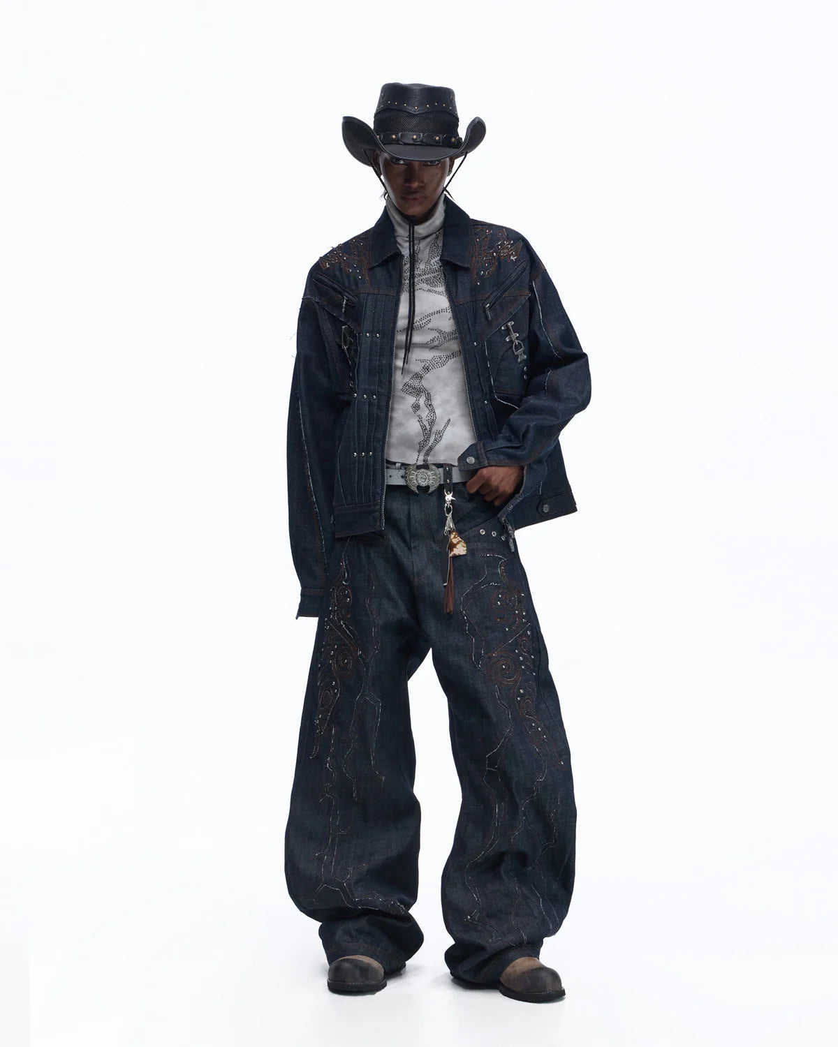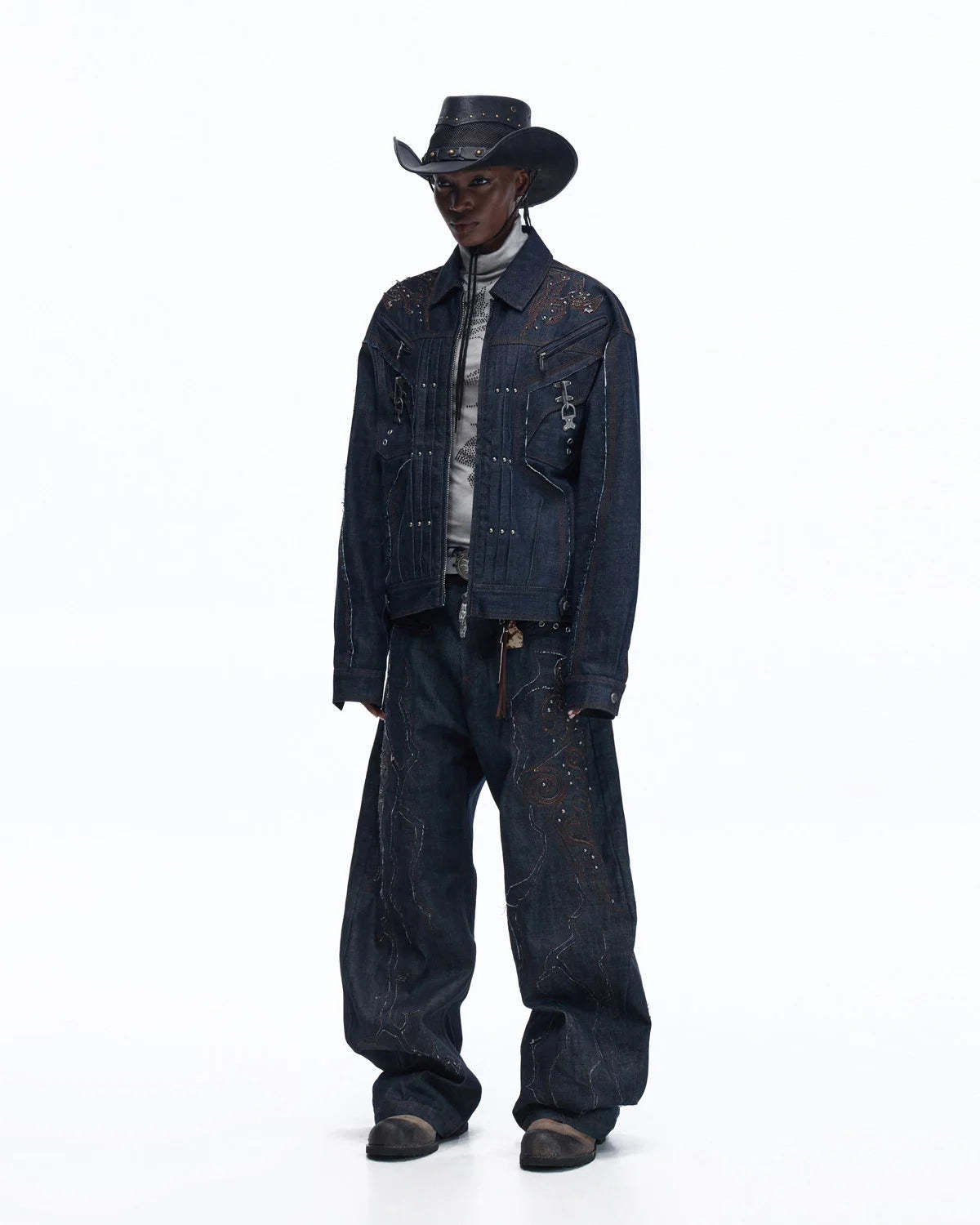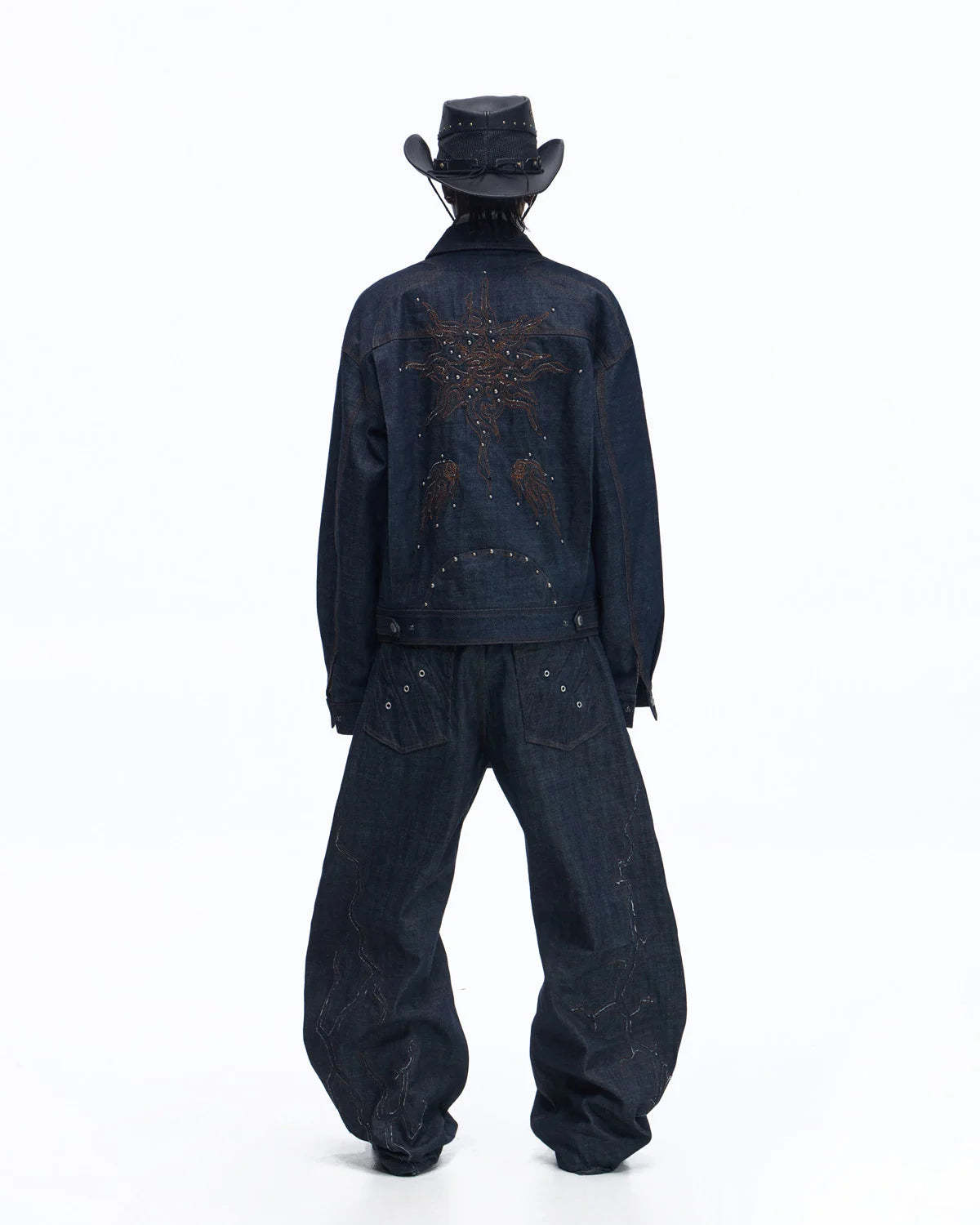 Personsoul Patchwork-Embroidered Raw Denim Curved Pants