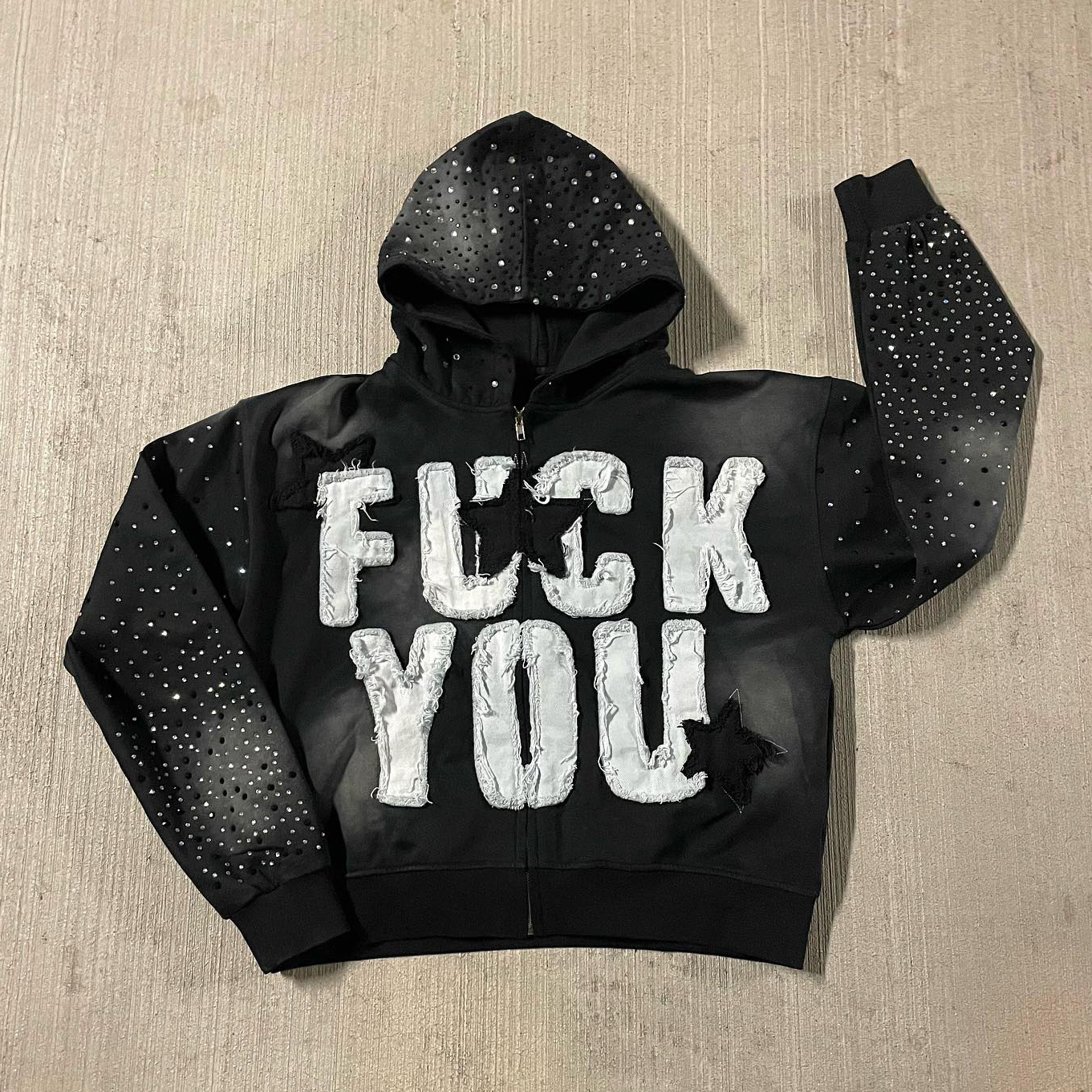 Retro Street Applique Embroidery and Rhinestone Zipper Hoodie