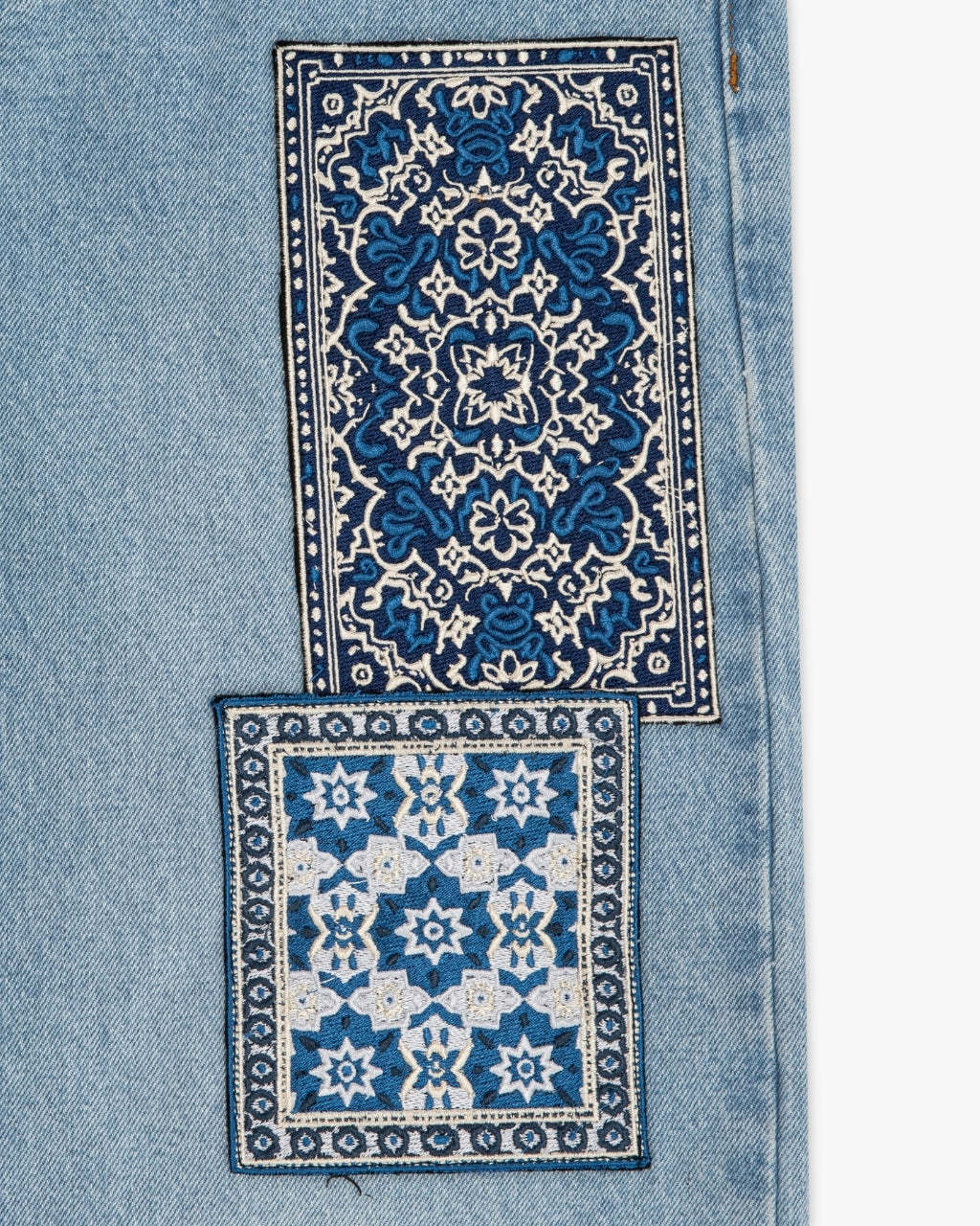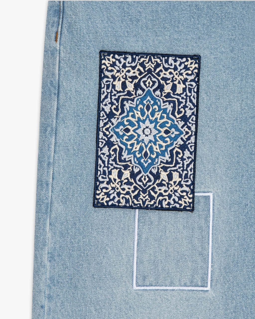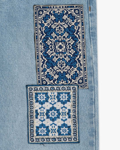 Each patch features a distinct motif in layered blues and creams, giving quiet depth to the silhouette. Signed off with a custom leather tab featuring sketch-style Vescartes branding.