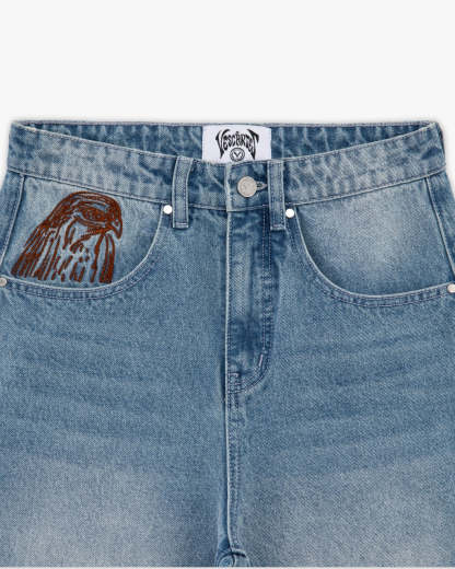 Cut in a light blue wash and elevated with intricate embroidery inspired by Arabic falconry traditions. A front-pocket eagle adds a subtle touch, contrasted by a large hero embroidery on the back — a falconer and his bird rendered across and beyond the rear pocket. Finished with a premium black leather Vescartes patch.